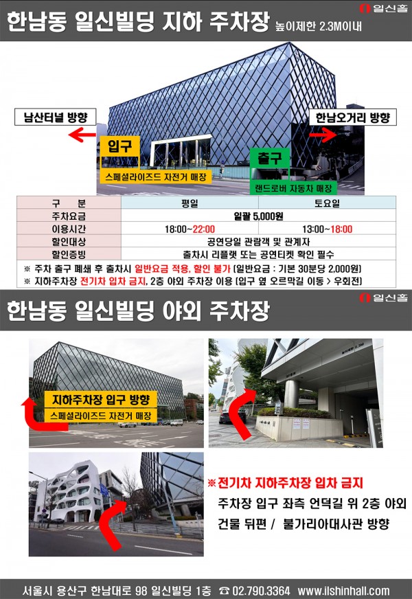 주차장 이용 및 금액은 어떻게 되나요? 페이지 정보 작성자 일신홀 작성일18-05-31 11:30 조회29,973회 댓글0건 관련링크 이전글 다음글 목록 본문 주소 : 서울시 용산구 한남대로 98(한남동 714) 일신빌딩 1층 Tel : 02-790-3364 이전글 다음글 목록